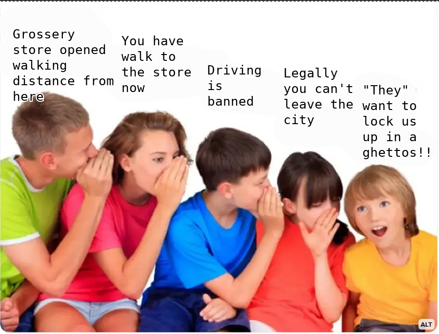 Literally this with the 15-minute cities idea. They took the idea of "things should be close by" and turned it into some kind of conspiracy where the government want to lock everybody in little walled gardens.